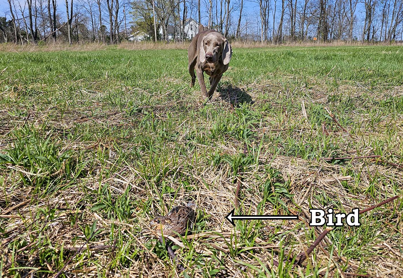 The breeze completely died when he was running and he ended up pointing right on top of his second bird (I should mention we have the birds in tip-up cages just in case he decided to grab). He was really nice and solid on this one. I flushed, and when the shot happened, I did tug on his collar slightly to remind him to stay, and he did. The bird was missed, so we went off in a different direction. I saw where the bird landed, so I decided to swing around later and go into the woods to find it. I probably should have quit while we were ahead, because Dolphin went on point in the woods, the bird flushed and he jumped in...didn't get the bird, but did NOT hold steady. Oops! Figures...always got to push the envelope just a little.