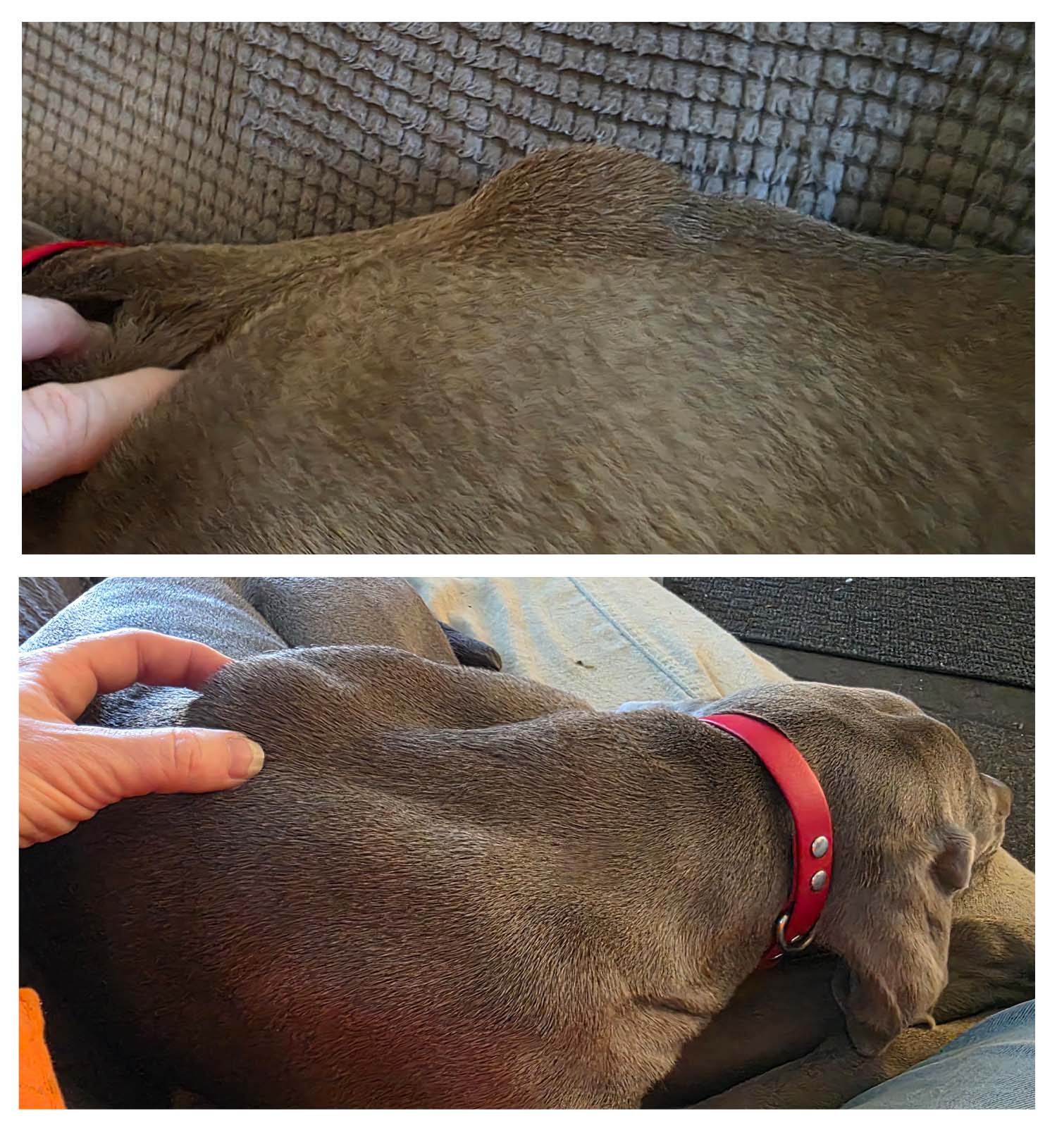 On Saturday, Bacon was outside playing with Dolphin and Noodle and when she came in, I noticed this big lump on her back between her shoulder blades. It's larger than a golf ball, and really hard and warm to the touch, and moves under the skin. It was not at all painful to her. Today I got her in to my vet, he scanned it and it is the exact location of her microchip. We are not sure if that is the issue, but he took a sample of the lump and it appears to be an abscess/infection. She is now on antibiotics and the lump seems to be going down a bit.