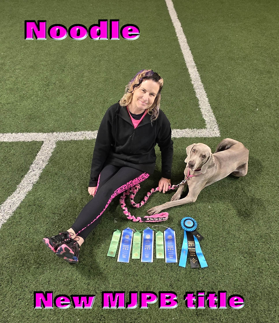 On Sunday Noodle was entered again. Both dogs blew FAST. Dolphin actually got the send (which was a very difficult 3 jump serpentine) but then charged ahead to grap some extra jumps which cost him time and we ran out of time before we could get enough points...only 6 points short. Poop. Noodle was NOT feeling it. We attempted the send and she made zero effort to go out and get the jump, so we opted to leave the ring. I am trying to get a read on her as to why she is doing so poorly this weekend. I know she hasn't been feeling well all week, but she seemed like she perked up by the end of the week and started eating better. Noodle redeemed herself with a pretty nice Standard run and Q, but fizzled out at jump #2 in jumpers so we left the ring and called it a day. Her Jumpers Q on Friday did earn her the MJPB (Master Jumpers Preferred Bronze) title, which was cool! Kind of silly since she has already earned her regular Master Jumpers Bronze title years ago, but when we dropped to preferred AKC made us start all over from scratch. Crazy.