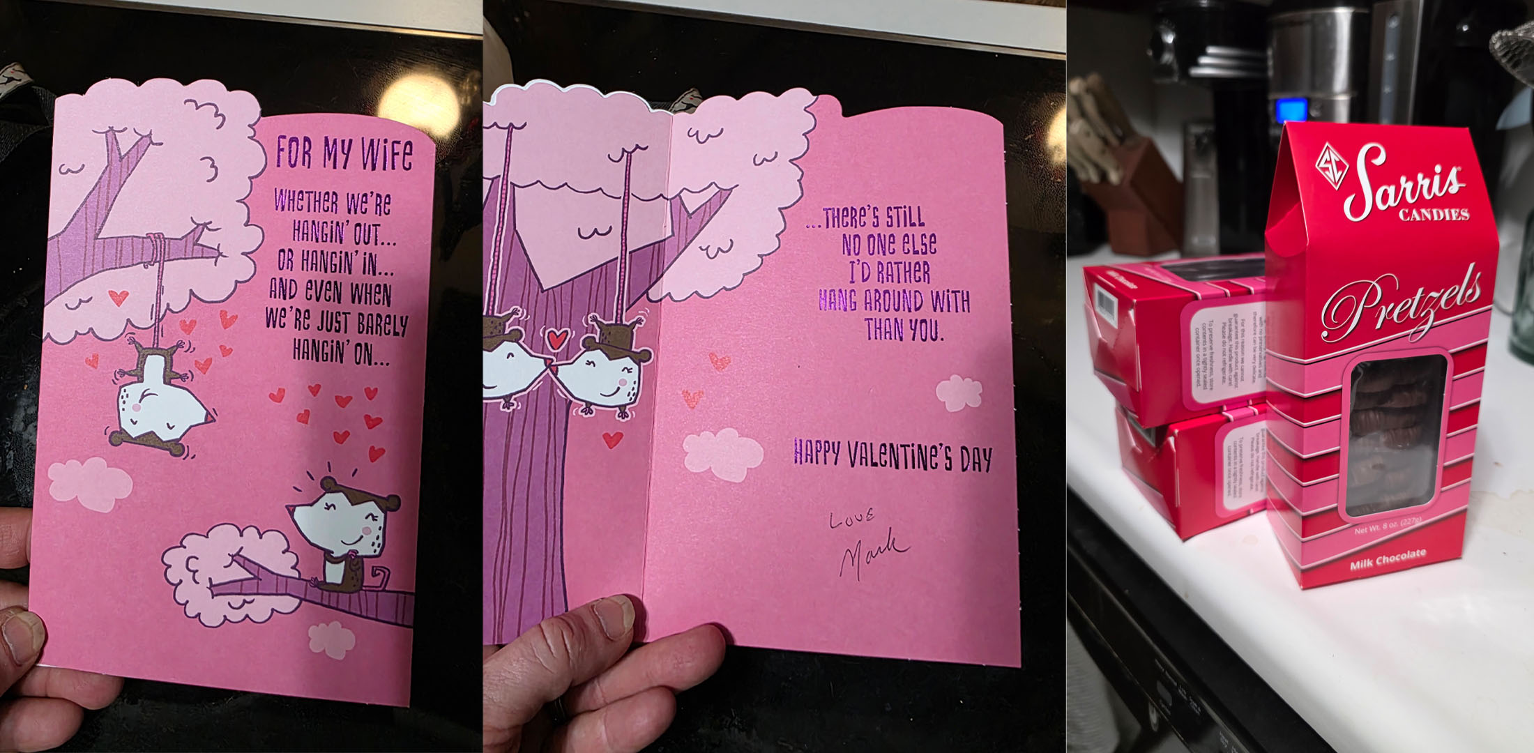 I have to share the valentine's card and gift Mark gave me the other day. I got addicted to these chocolate covered pretzels when my friend brought some home from Pittsburgh, so of course Mark went and found where he could buy them locally and got me three boxes. That's Mark - he's always doing for everybody else.