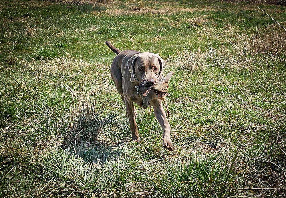 He was super solid on his first bird, pointing from a decent distance away. He went on point, then moved to the left and went on point again and stayed solid. I flushed and he stood, he did break on the shot, and did a messy retrieve. The bird had guts hanging out of it, so he wasn't liking it in his mouth. I don't blame him!