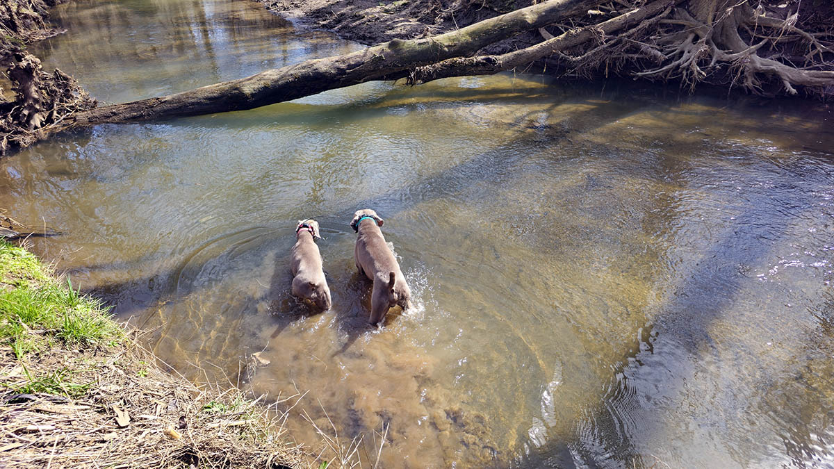 It was incredibly muddy, and it made the woods a major slip hazard, but both dogs had a great time. They were covered in mud, so I encouraged (and it took very little encouragement!) them to pop into the creek to get some of the mud off. Great idea, although now they were WET and running through the muddy woods, so the mud was inevitable.