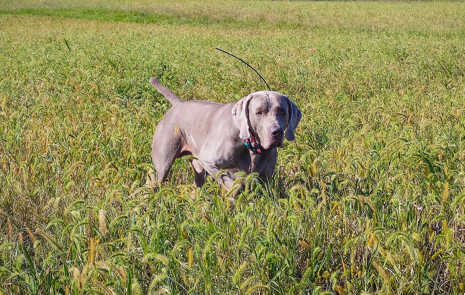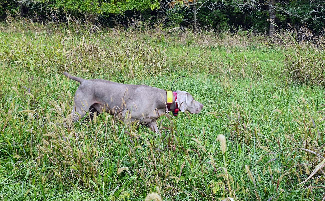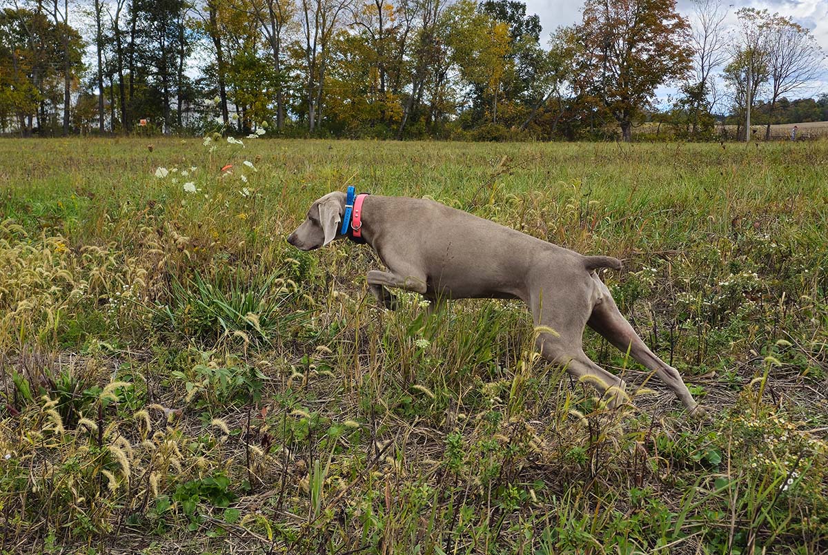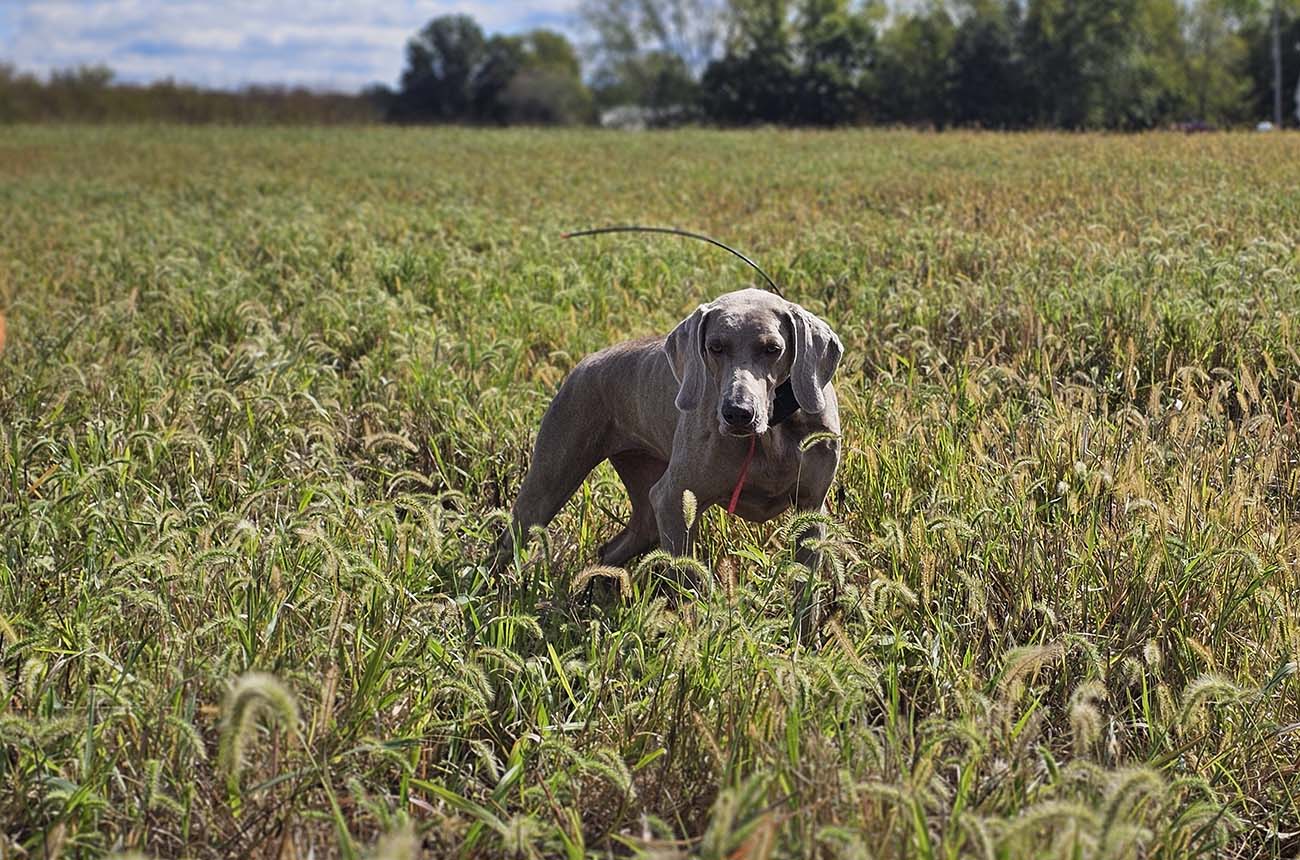 Dolphin was wonderful in training today. I opted to not have him do any retrieves as he gets a little 'high' when he retrieves a lot...and we have our SDX test (Shooting Dog Excellent - kind of like Master Hunter but for the Weimaraner Club) tomorrow. Tomorrow will be a good test to see if he is truly ready for Master. Today I just blanked the birds. The birds didn't fly well so they landed not too far away as if they were shot, and he was steady. I was able to heel him off in the opposite direction, so that was good. Our second bird was a mystery as he whipped around and stopped on point in a weird U-shape. I could not find the bird, so I did something I have not done before with him - I relocated him. I figured hey, why not, it's training! He turned his body around in the direction his head was pointing, and he took maybe one step and really pointed way down low...the bird was right under his head now. My bad, I should have looked farther to his left since that's how he was bent. I managed to get my foot under his chin and roll the bird out and flush it, and he stood perfectly! It was a good training exercise, having him relocate on command and still stay steady.