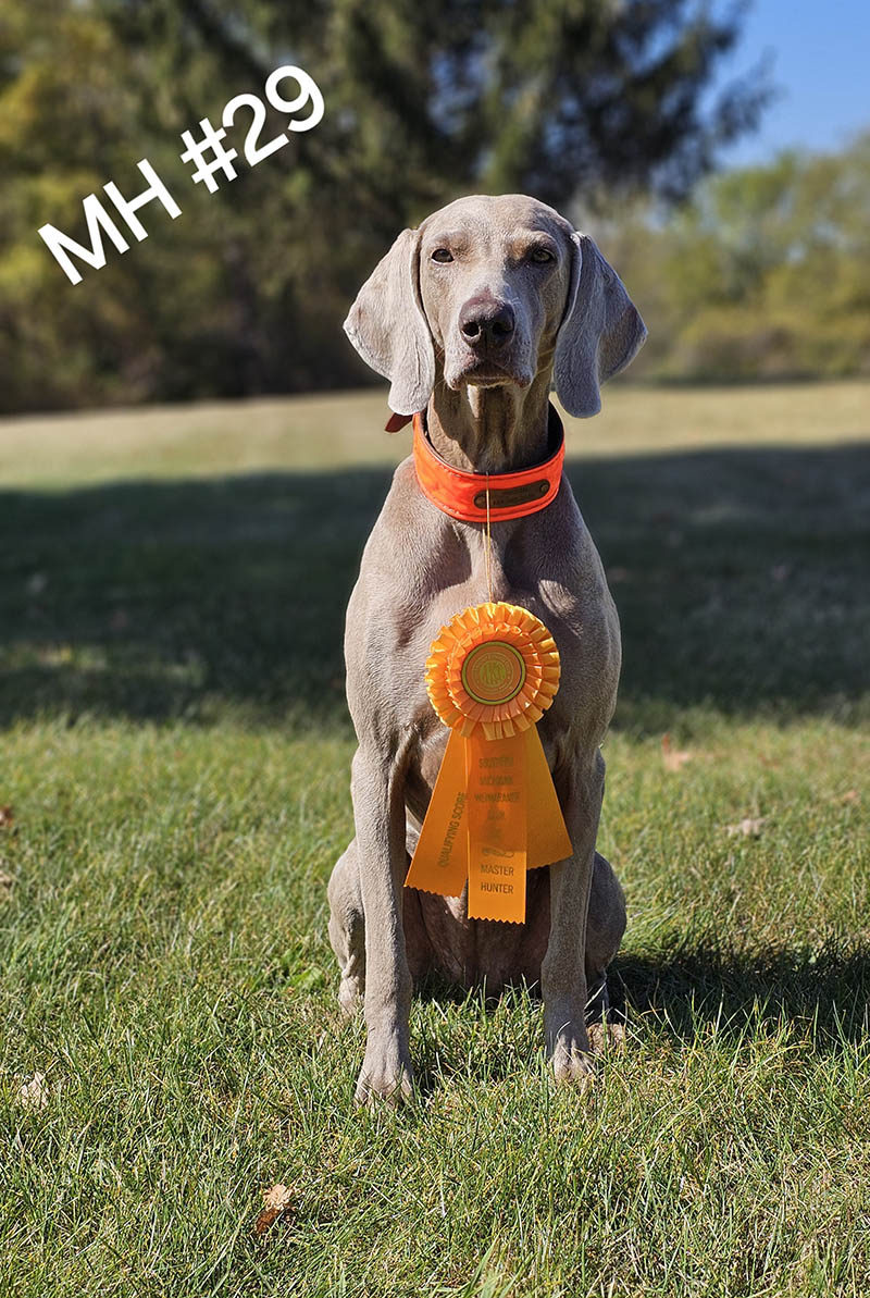 I judged the whole AKC hunt test both days this weekend, and I judged the lower two levels of the Weimaraner Club of America shooting ratings test. I was able to run Dolphin in Shooting Dog Excellent (SDX), which is the highest ratings test offered, very similar to Master Hunter. Dolphin was such a good boy! It was horribly hot by the time we ran in the middle of the afternoon - 80+ degrees. He was pretty stellar on his bird work - had three points, gunners missed all 3 birds so I had to toss one to get the retrieve. He was not the steadiest on the thrown bird, but he had been ROCK steady on the previous three birds. His retrieve was so-so, he struggled to breathe while retrieving in the heat. However, it was a pass, so I'll take it! Dolphin doesn't handle the heat well, I expect that's largely (no pun intended) due to his big size.