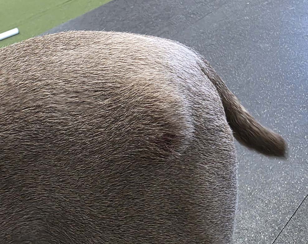 On Saturday, Bacon was outside playing with Dolphin and Noodle and when she came in, I noticed this big lump on her back between her shoulder blades. It's larger than a golf ball, and really hard and warm to the touch, and moves under the skin. It was not at all painful to her. Today I got her in to my vet, he scanned it and it is the exact location of her microchip. We are not sure if that is the issue, but he took a sample of the lump and it appears to be an abscess/infection. She is now on antibiotics and the lump seems to be going down a bit.